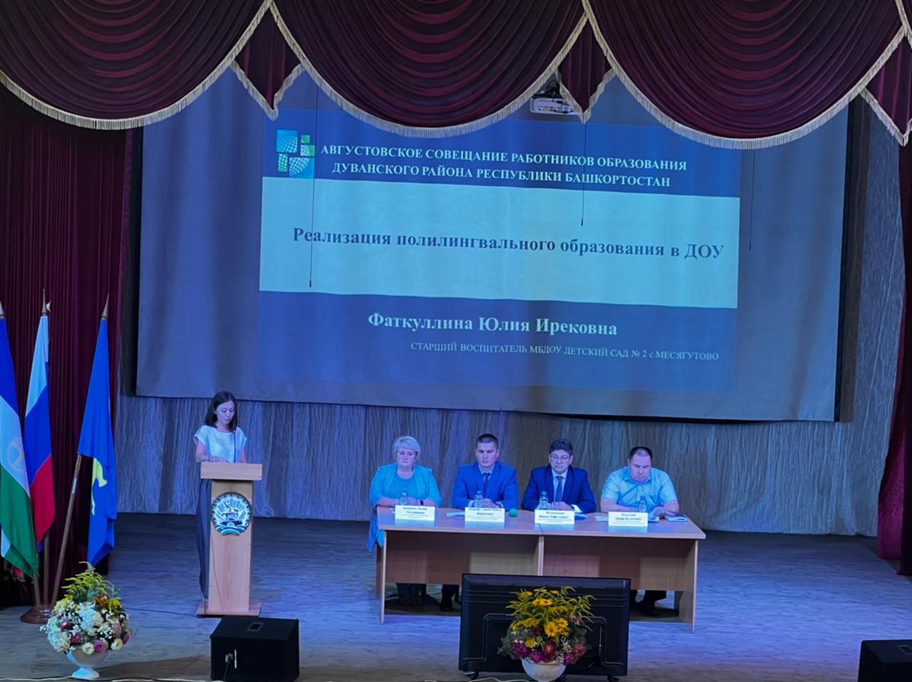25 августа в преддверии начала учебного года состоялось совещание по образованию. Тема августовского совещания "Единое образовательное пространство как фактор формирования и воспитания личности в системе образования Дуванского района" В работе совещания приняли участие Мухамадеев Фаиль Рафаэлевич, Глава Администрации МР Дуванский район РБ, Шарафутдинов Наиль Фанилевич, заместитель председателя Государственного комитета Республики Башкортостан по тарифам, Абдуллин Айдар Булатович, заместитель главы Администрации МР Дуванский район РБ по социальным вопросам, Закирова Лилия Таллиновна, и. о. начальника МКУ "Отдел образования Администрации муниципального района Дуванский район РБ.