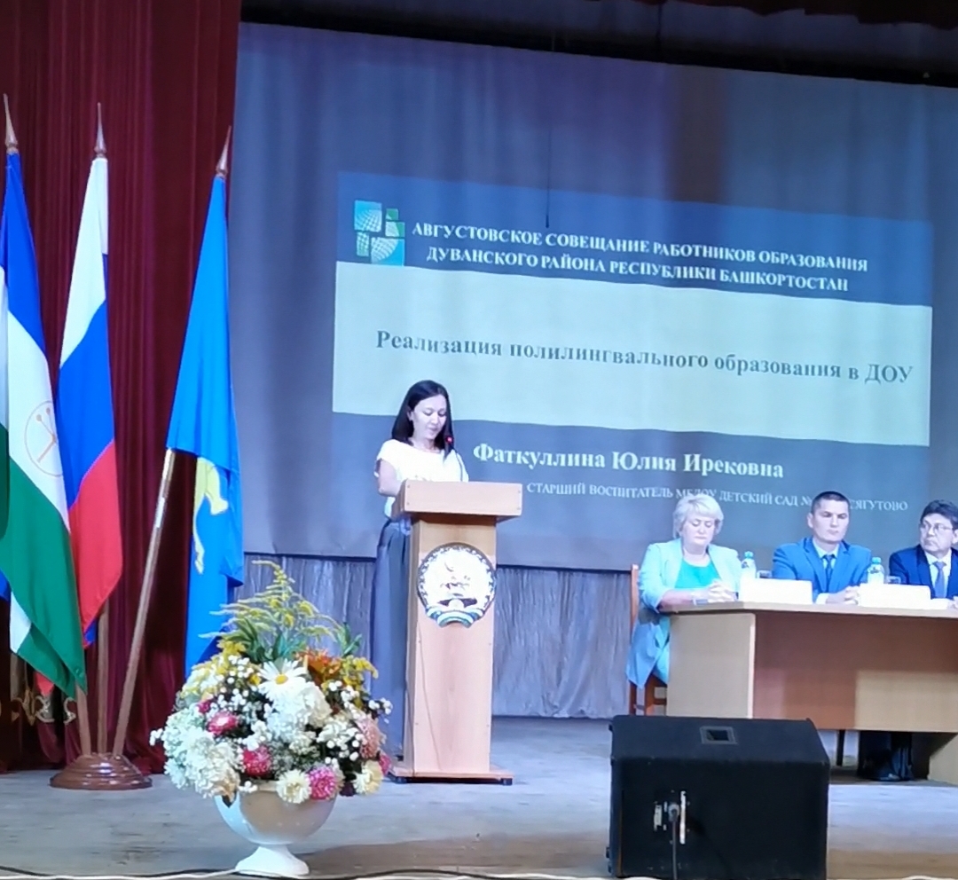 Из нашего детского сада выступила старший воспитатель Фаткуллина Юлия Ирековна с темой "Реализация полилингвального образования в ДОУ"